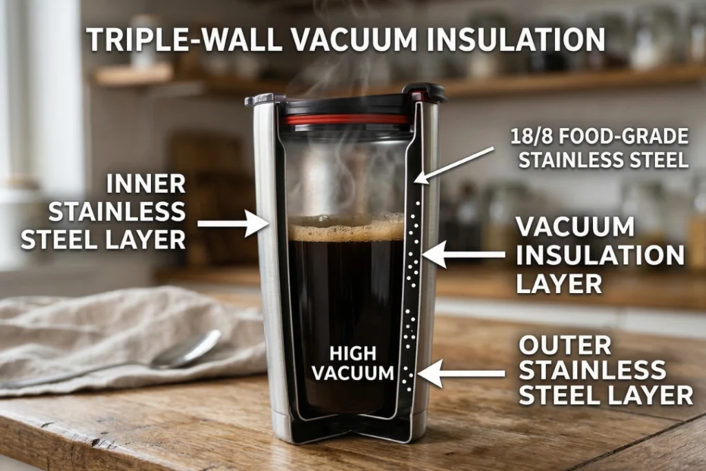หลายคนรู้ว่าแก้วสแตนเลสสามารถเก็บความร้อนหรือความเย็นได้หลายชั่วโมง แต่ไม่ค่อยมีใครรู้ว่า ด้านในของแก้วหนึ่งใบมีโครงสร้างที่ถูกออกแบบอย่างตั้งใจมาก ไม่ใช่แค่โลหะธรรมดาชิ้นเดียว ความจริงแล้ว แก้วเก็บอุณหภูมิส่วนใหญ่ที่ใช้กันในปัจจุบันถูกออกแบบด้วยหลักการทางวิศวกรรมความร้อน เพื่อ ลดการถ่ายเทความร้อนระหว่างเครื่องดื่มกับอากาศภายนอก ผลลัพธ์คือเครื่องดื่มสามารถคงอุณหภูมิได้ยาวนาน ไม่ว่าจะเป็นกาแฟร้อนหรือเครื่องดื่มเย็น ก่อนจะเข้าใจเรื่องการเคลือบภายในแก้วสแตนเลส จึงต้องเข้าใจโครงสร้างพื้นฐานของแก้วประเภทนี้ก่อน ซึ่งโดยทั่วไปแล้ว แก้วเก็บอุณหภูมิจะมีโครงสร้างหลักอยู่ 3 ชั้น